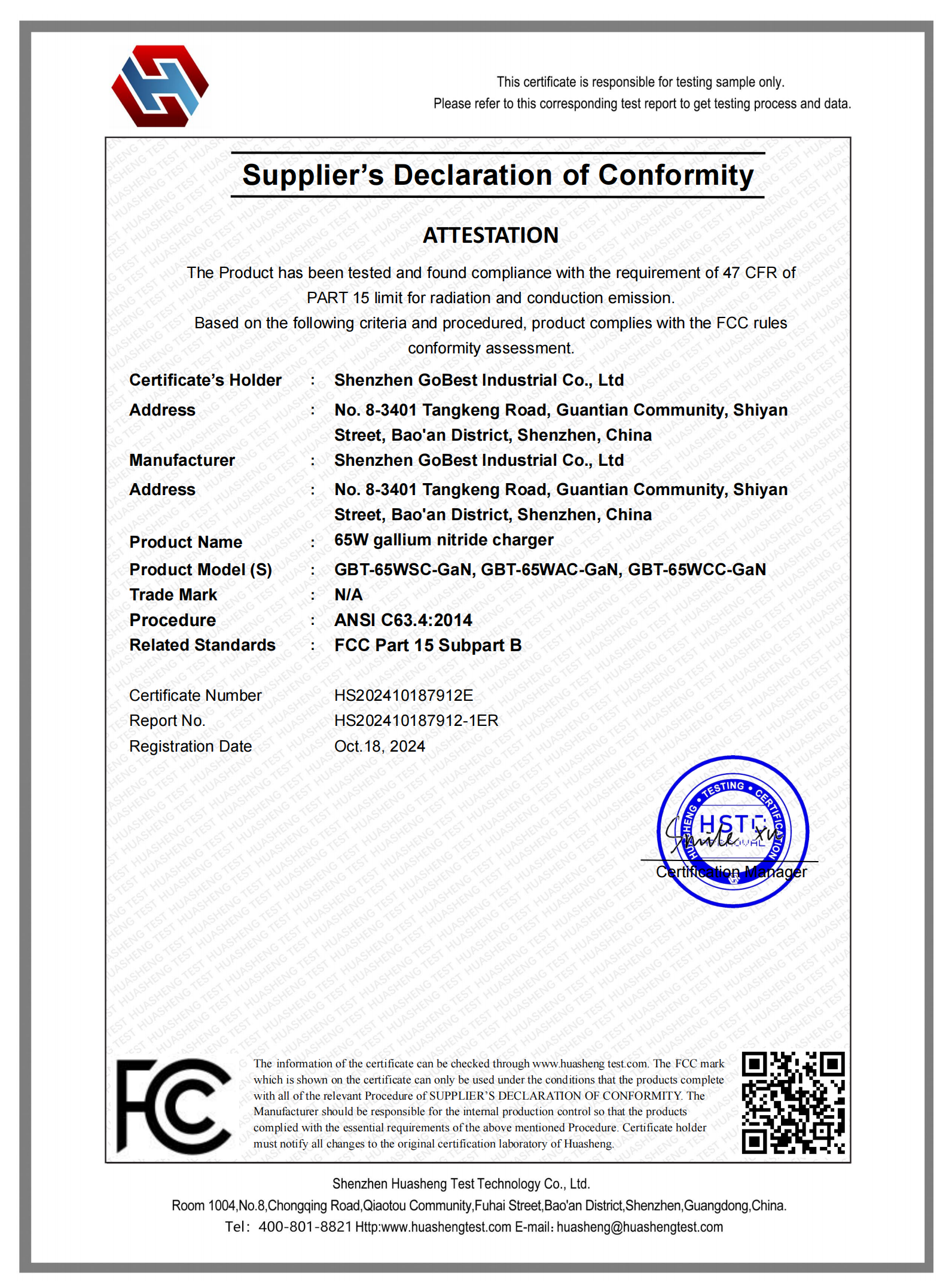 顧佰特65W超薄氮化鎵快充-FCC證書