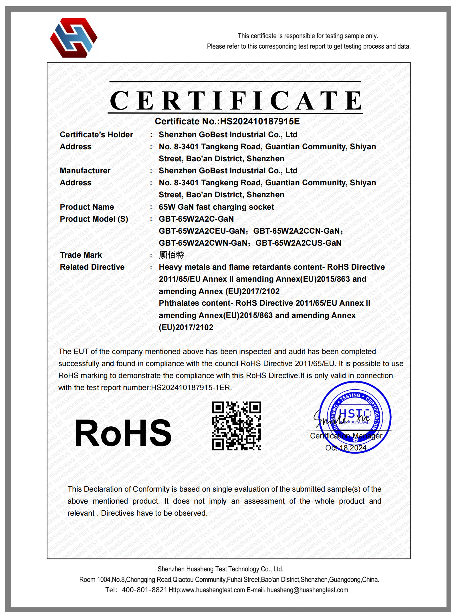 顧佰特65W氮化鎵多功能插線板-ROHS證書